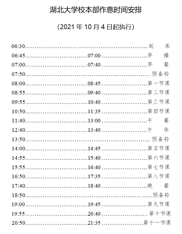 六、从10月4日(星期一)起,校本部执行新的作息时间,下午上班(课)时间调整为14:00,下班时间调整为17:30。请各单位于9月30日前通知到全体教职员工和学生。通识教育学院作息时间不作调整。