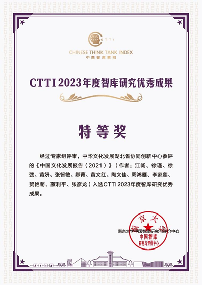 12月11日,由南京大学、云南大学、江苏省社会科学院共同主办的“2023新型智库治理论坛”在云南昆明举行。全国各级思想理论和智库管理部门、重点高校科研管理部门、中国智库索引(CTTI)来源智库成员等400余名代表参会。会议发布了2023年度CTTI来源智库优秀研究成果,由我校研创的《中国文化发展报告(2021)》荣获优秀成果特等奖。这是我校继2022年后再次荣获特等奖。