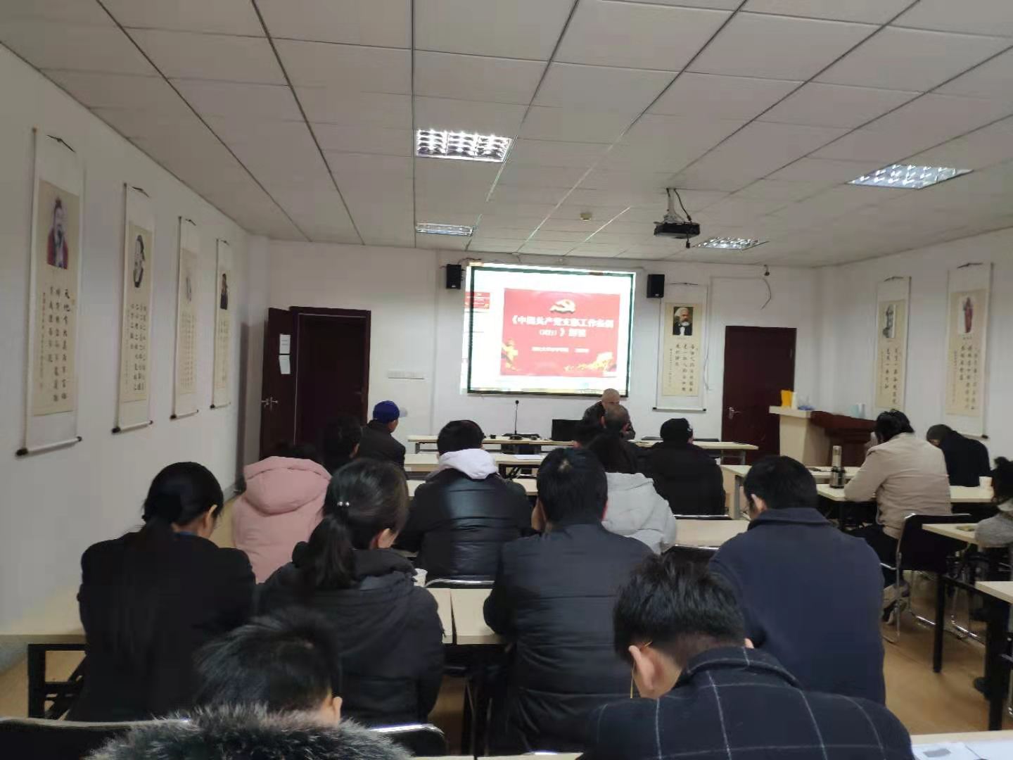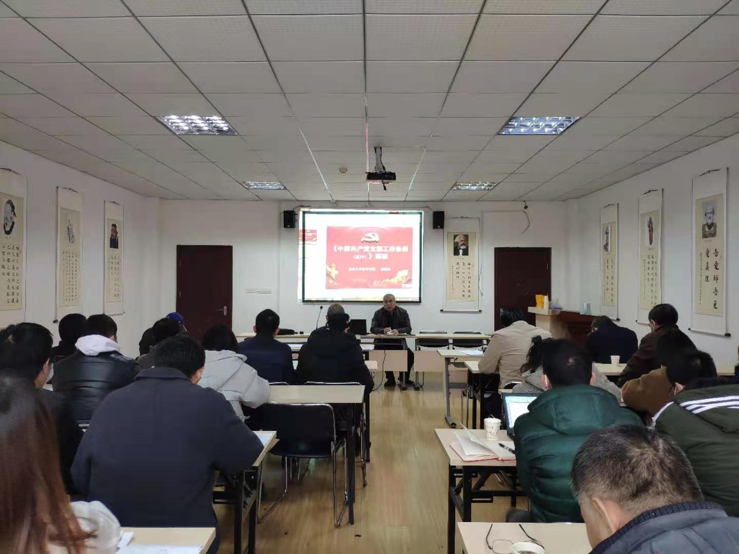 为深入开展党史学习教育,近日,365英国在逸夫人文楼D2008教室举行专题学习会,重要学习《中国共产党普通高等学校基层组织工作条例》与《中国共产党支部工作条例(试行)》,党委书记汤德森带领学院辅导员、班主任、各支部书记、支委开展学习、研读。