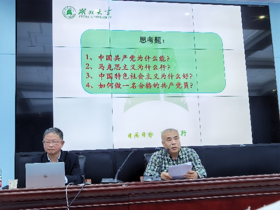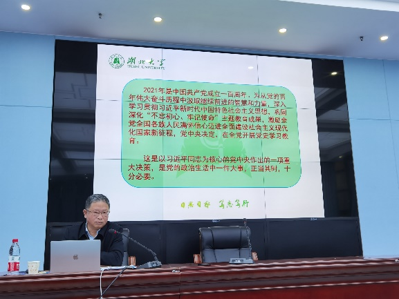 檀坤华同志强调,我们要贯彻落实习近平总书记在党史学习教育动员大会上的重要讲话精神,积极引导广大师生学史明理、学史增信、学史崇德、学史力行,真正做到学党史、悟思想、办实事、开新局;各级党组织要切实强化党内监督,坚持自我革命,加强党员党性锻炼,推动实际工作,做到思想上高度统一、政治上清醒坚定、行动上坚决有力,确保党的先进性和纯洁性,永葆青春活力。全体党员要认真研读《论中国共产党历史》、《毛泽东邓小平江泽民胡锦涛关于中国共产党历史论述摘编》、《习近平新时代中国特色社会主义思想学习问答》、《中国共产党简史》四部党史基本著作,并结合日常工作实践深刻思考“中国共产党为什么能?”“马克思主义为什么行?”“中国特色社会主义为什么好?”“如何做一名合格的共产党员?”等问题。