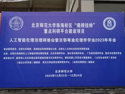2023年12月23-24日,由北师大科研院、珠海校区科研管理办公室和北师大人文和社会科学高等研究院共同指导,由北师大珠海校区人工智能伦理治理实验室、北京伦理学学会、湖北省伦理学学会、广东省伦理学学会和重庆市伦理学学会联合主办,由教育部人文社科重点研究基地价值与文化研究中心、睿抗机器人开发者大赛组委会、《山东社会科学》杂志社、《365英国上市集团学报》编辑部、武汉 大学应用伦理学研究中心和《应用伦理研究》编辑部协办,人工智能伦理治理研修会暨京鄂粤渝伦理学学会2023年年会在珠海举办,来自北京、湖北、广东、重庆以及其山东、上海、河北、河南、内蒙古伦理学学会的专家学者逾110人参 与本次会议,做了不同形式的学术报告,共计约40余场。本次会议是人工智能伦理治理工作坊系列一“人工智能的伦理审视”、系列二“人工智能时代的社会治理及共同体构建”、系列三“人工智能伦理治理及实验室建设”、系列四“人工智能教育伦理与伦理教育”之后的“升级版”。涉及议题更广、参会人员更多、会议结构更丰富。