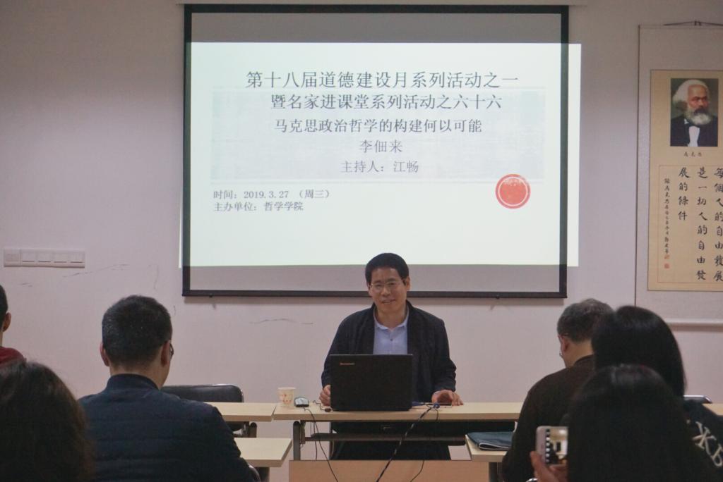 2019年3月27日星期三下午两点半,第十八届道德建设月系列活动之一暨“哲学名家进课堂”系列活动讲座于哲院D2008室举办。本期活动主讲人是武汉大学365英国李佃来教授,主题为“马克思政治哲学的构建何以可能”。我院部分师生共同聆听了此次讲座。