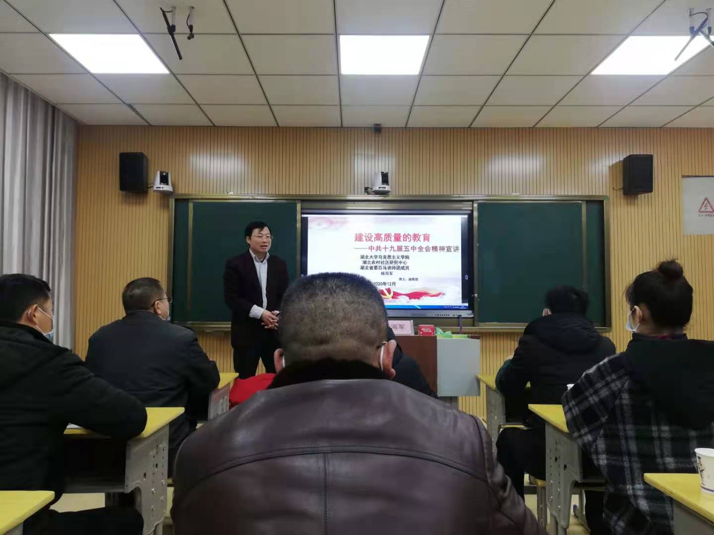 杨海军副教授以《建设高质量教育》为题,宣讲了十九届五中全会的主要内容,同时为建设高质量的教育进行了有针对性的重点宣讲。在宣讲中指出,建设高质量的教育关键在于全面贯彻党的教育方针,坚持立德树人,加强师德师风建设,培养德智体美劳全面发展的社会主义建设者和接班人。必须健全学校家庭社会协同育人机制,提升教师教书育人能力素质,增强学生文明素养、社会责任意识、实践本领,重视青少年身体素质和心理健康教育;坚持教育公益性原则,深化教育改革,促进教育公平,推动义务教育均衡发展和城乡一体化,完善普惠性学前教育和特殊教育、专门教育保障机制,鼓励高中阶段学校多样化发展;加大人力资本投入,增强职业技术教育适应性,深化职普融通、产教融合、校企合作,探索中国特色学徒制,大力培养技术技能人才;提高高等教育质量,分类建设一流大学和一流学科,加快培养理工农医类专业紧缺人才;提高民族地区教育质量和水平,加大国家通用语言文字推广力度。支持和规范民办教育发展,规范校外培训机构。发挥在线教育优势,完善终身学习体系,建设学习型社会。