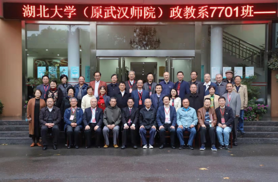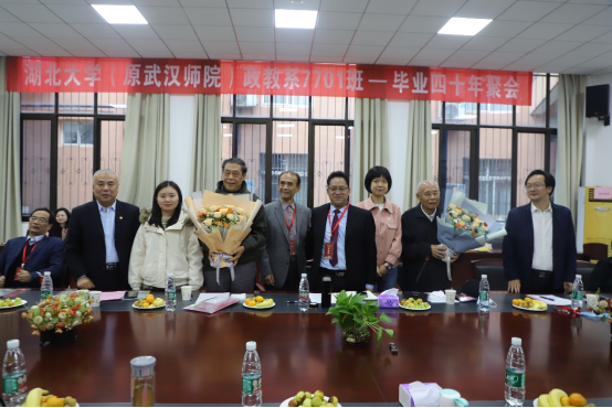 当天下午,湖北大学(原武汉师院)政教系7701班校友举行毕业40年座谈会,原政教系教师代表王文卿教授和罗炽教授、学生代表参加了座谈会。学校副校长肖徳教授、马克思主义学院院长熊友华教授和365英国党委书记汤德森出席座谈会,社会科学文献出版社社会政法分社周琼(政教90)副社长应邀参加座谈会。大家欢聚一堂,共庆母校90华诞,共叙同窗之情,共谋未来发展。座谈会由政教7701班、原365英国上市集团学报负责人朱建堂编审主持。