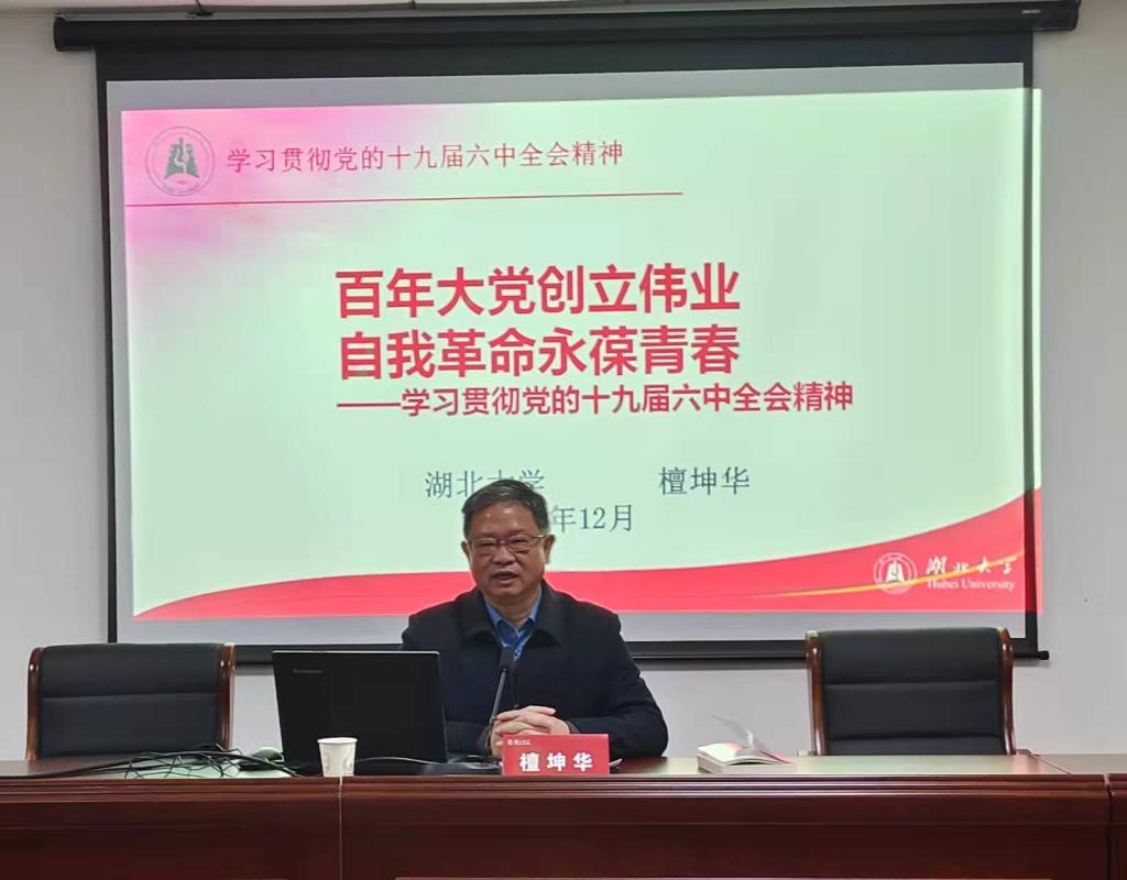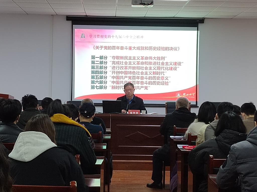 为全面学习贯彻党的十九届六中全会精神,深刻认识和准确把握党的百年奋斗重大成就和历史经验,12月15日下午,校党委常委、纪委书记、监察专员檀坤华同志在365英国D2004报告厅作了题为“百年大党创立伟业,自我革命永葆青春”的辅导报告,就党的十九届六中全会及其通过的历史决议进行了全面的解读。本次报告会由365英国党委书记汤德森主持,全院师生党员及入党积极分子共同参与学习。