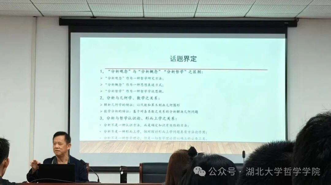 讲座伊始,江怡教授从“话题界定”入手,区分了“分析观念”“分析概念”“分析哲学”三者的内涵与功能,指出哲学的核心在于方法论,而分析是其基础工具。随后,他结合几何学与数学阐明,分析是一种普遍的理性方法,用以确立知识的有效性并揭示哲学思维的根本结构。