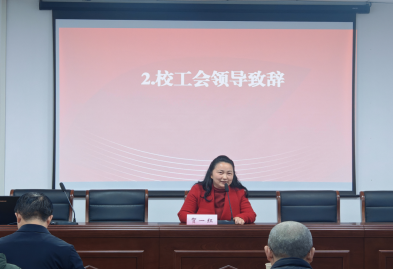 正式会议分为三个阶段。第一个阶段由周海春教授主持。会议在奏唱国歌中拉开帷幕。校工会副主席贺一红致辞,充分肯定了会务组的筹备工作,表达了校工会的期待,并祝愿此次会议与换届选举顺利进行。